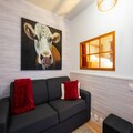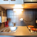 Inside, the open-plan layout includes a fully equipped kitchen with an electric stove, microwave, refrigerator, coffee machine, toaster, and kettle—everything you need to prepare meals with ease. A TV and hair dryer add extra comfort, making this compact space both practical and inviting.