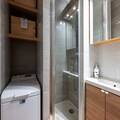 The sleeping arrangements are thoughtfully designed: a cabin with two single beds (90x190) perfect for children or friends, and a snug bedroom with a double bed (140x190) for restful nights. The modern bathroom features a shower, towel dryer, and separate WC, while added conveniences like WiFi, a washing machine, and full bedding ensure a hassle-free stay.