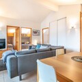 The heart of the home is a spacious open-plan living area that feels like a modern mountain lodge. The kitchen is a dream for those who love to cook, fully kitted out with an oven, freezer, dishwasher, and all the small gadgets like a coffee machine and toaster for a slow Alpine breakfast. You can take your morning coffee out onto the balcony to watch the mist lift off the peaks, or gather around the dining table for a raclette night in the evening. With an elevator in the building and electric heating to keep things toasty, every comfort is covered.