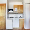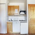 Kitchenette(cooker(4 ring stoves, electric), coffee machine, microwave, dishwasher, fridge), Living/bed room(double sofa bed), sleeping cabin(bunk bed), bathroom(shower, toilet), ski storage(shared entrance), balcony, swimming pool(shared with other guests, heated)