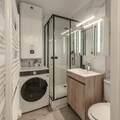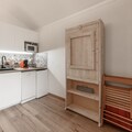 The clever sleeping arrangement includes a bedroom area with both a double bed and a bunk bed, creating a snug and practical setup for adults and children. Despite its compact size, the kitchen is impressively equipped with modern conveniences rarely found in smaller mountain apartments, including a dishwasher, microwave, and coffee machine. A modern bathroom with a shower and a private balcony—perfect for breathing in the crisp mountain air—complete the interior, ensuring you have everything you need for an efficient and enjoyable stay.