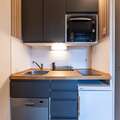 Inside, the open-plan kitchen is fully equipped with a refrigerator, microwave, dishwasher, coffee machine, toaster, and kettle—perfect for self-catering. All utensils and dishes are provided, making meal prep simple and stress-free. With modern amenities and unbeatable access to the slopes, this studio is a smart choice for a memorable mountain holiday.