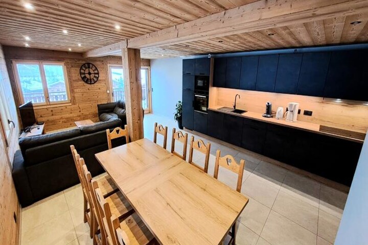 At the heart of the charming old village of Le Chinaillon, this spacious 139 m² garden-level apartment offers an inviting retreat for up to nine guests. With its south-facing terrace, you’ll wake up to breathtaking views of the surrounding mountains, basking in the natural beauty of the French Alps. The tranquil setting provides the perfect blend of serenity and accessibility, making it an ideal choice for families or groups seeking a memorable alpine getaway. \n\nInside, the apartment combines rustic charm with modern comfort. The thoughtfully designed layout ensures ample space for relaxation and togetherness, while the fully equipped kitchen makes it easy to prepare meals after a day of adventure. Bed linens, towels, and kitchen linens are provided for your convenience, and parking is available in the outdoor lot. Whether you’re unwinding in the cozy living area or soaking up the sun on the terrace, every corner of this property invites you to feel at home. \n\nLocated just 700 meters from the center of Le Chinaillon and the downhill ski slopes, you’re perfectly positioned to explore the region’s renowned ski trails. The free shuttle stop is only 150 meters away, offering effortless access to nearby attractions. In summer, the area transforms into a haven for hiking and mountain biking, with trails that showcase the stunning alpine landscapes. Grand-Bornand and the surrounding villages are brimming with authentic charm, local markets, and delightful dining options. \n\nWhether you’re here to carve through powdery slopes or to immerse yourself in the peaceful ambiance of the mountains, this apartment is your gateway to unforgettable experiences in the French Alps.
