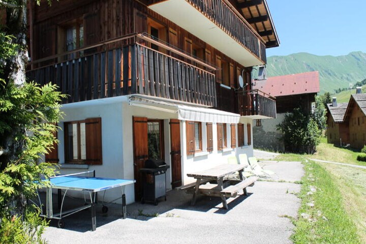 Surrounded by the majestic peaks of the French Alps, this charming ground-floor apartment in a traditional chalet offers an idyllic retreat for up to nine guests. With its spacious 87 m² layout and breathtaking mountain views from the terrace, it’s the perfect setting for creating unforgettable memories with family or friends. Whether you're seeking adventure on the slopes or a peaceful alpine escape, this property provides a welcoming base for all seasons. \n\nInside, the apartment is thoughtfully equipped to ensure a comfortable stay. The open-plan living area invites relaxation after a day of exploring, while the kitchen is ready for shared meals and cozy evenings in. The layout is ideal for larger groups, with plenty of space for everyone to unwind. Pets are welcome, so you can bring your furry companion along for the adventure. Convenient amenities such as outdoor parking and the option to rent bed linen and towels make your stay hassle-free. \n\nLocated just 1.5 km from the charming center of Chainaillon Le Grand-Bornand, the apartment is perfectly positioned to enjoy the best of the region. The downhill ski slopes are a mere 800 meters away, and a free shuttle stop is conveniently located just 50 meters from your door, ensuring easy access to the area’s attractions. In summer, the surrounding trails and natural beauty offer endless opportunities for hiking, biking, and soaking in the serene alpine atmosphere. \n\nWhether you're drawn by the thrill of winter sports or the tranquility of summer in the mountains, this delightful chalet apartment is your gateway to the wonders of the French Alps. Book your stay and experience the magic of this enchanting destination.