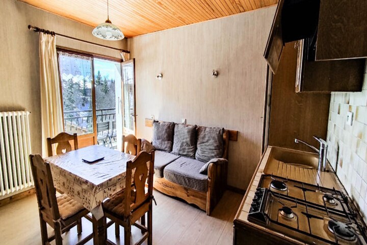 The 40m² apartment, located on the first floor, comfortably accommodates up to five guests. Its thoughtful layout ensures a cozy stay, with a bright and airy living space that opens onto the balcony. While bed linens and towels are not provided, the apartment is equipped with essential amenities for a comfortable stay. Parking is conveniently available in an outdoor lot, and a free shuttle stop is just 100 meters away, ensuring easy access to nearby attractions. Please note that pets are not allowed, and cleaning is required upon departure.