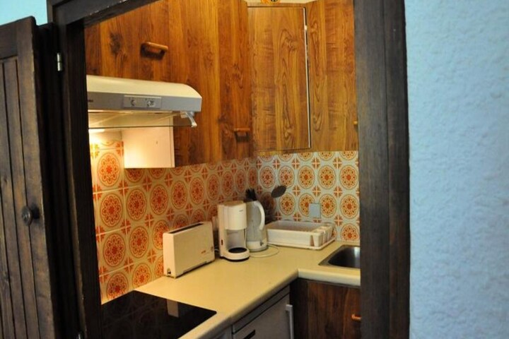 Inside, the 39m² apartment is thoughtfully designed to accommodate up to six guests. The layout includes a separate kitchen for preparing hearty meals after a day of adventure, a living room with a comfortable sofa bed, a cozy bedroom with two single beds, and a mountain alcove featuring bunk beds. The bathroom includes a bathtub, perfect for unwinding after exploring the slopes or trails. With its warm and functional design, this rental is ideal for families or small groups seeking a memorable alpine getaway.