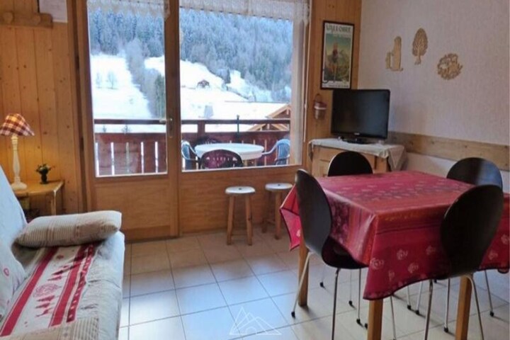 High above the charming village of Grand Bornand, this delightful apartment offers a serene retreat with breathtaking views of the Aravis mountain range. Imagine sipping your morning coffee on the south-facing balcony as the sun rises over the peaks, casting golden hues across the valley below. Whether you’re here for winter adventures or summer escapes, this cozy haven invites you to immerse yourself in the beauty of the French Alps. Located just 500 meters from the ski lifts and 900 meters from local shops, convenience meets tranquility in this idyllic setting. \n\nInside, the apartment boasts a thoughtfully designed layout that comfortably accommodates up to four guests. The open-plan kitchen and living room create a welcoming space for shared meals and relaxation after a day of exploring. The bedroom features a snug double bed, while the alcove offers two single bunk beds, perfect for families or small groups. Modern amenities such as a shower, separate WC, and heating ensure a comfortable stay, while the balcony becomes your private vantage point to soak in the alpine scenery.\n\nBeyond the apartment, Grand Bornand Village offers a quintessential alpine experience with its charming streets, local markets, and traditional eateries. In winter, the nearby ski lifts provide access to pristine slopes, while summer transforms the area into a haven for hiking, cycling, and discovering the lush landscapes of the Aravis range. Whether you’re seeking thrilling outdoor activities or peaceful moments surrounded by nature, this location delivers it all.\n\nEscape to this cozy retreat and create unforgettable memories in the heart of the French Alps. With its unbeatable views, convenient location, and warm ambiance, this apartment is your gateway to an authentic alpine adventure.