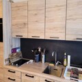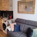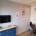 Inside, the studio is thoughtfully designed to maximize space and functionality. The open-plan kitchen and living area create a welcoming atmosphere, complete with a comfortable sofa bed (140 cm). The sleeping alcove, equipped with cozy bunk beds (2 x 90 cm), is perfect for families or small groups. The modern bathroom features a shower and toilet, ensuring all the essentials for a relaxing stay are at hand. Please note that bed linen and towels are not provided, and a tourist tax is payable by adults.