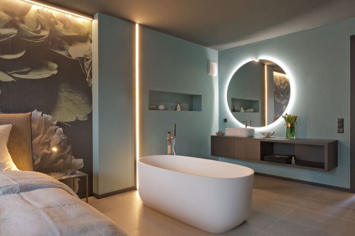 Inside, you will find a friendly and functional living atmosphere with two bedrooms and two bathrooms, including both a shower and a bathtub for your convenience. The entire flat is equipped with underfloor heating to ensure cosy warmth even on colder days. The washing machine and tumble dryer for your sole use emphasise the comfort of this accommodation. A kitchenette with a two-ring hob, capsule coffee machine, dishwasher and kettle completes the offer and allows you to cater for yourself.