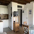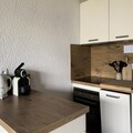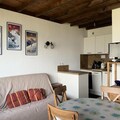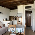 The studio includes a living room with an HD TV, a kitchen area equipped with an oven, microwave, three induction burners, fridge/freezer, dishwasher, filter coffee maker, kettle, toaster, raclette grill, crepe maker, and small plancha. The bathroom features a bathtub and WC. A ski box (level -1) is provided, and parking is available nearby. A deposit is required.
