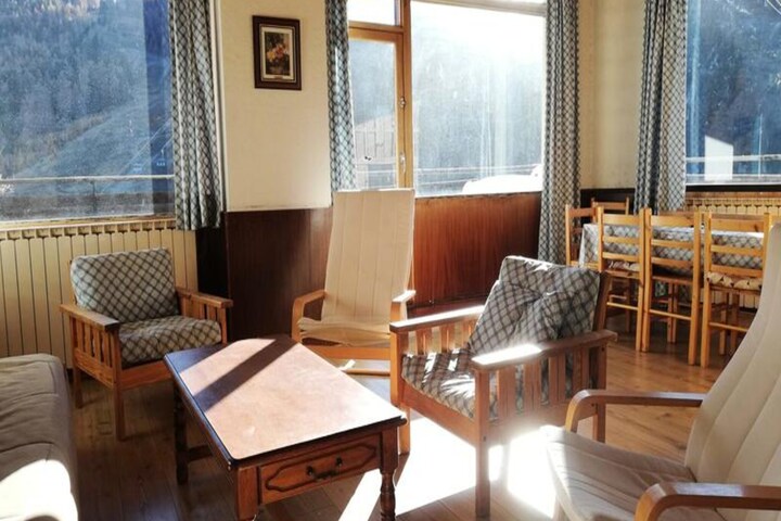 This spacious 3-room apartment is perfect for up to 8 guests, offering a comfortable and functional stay. The living room features a sofa bed, flat-screen TV, armchairs, and a large dining table, all with access to a large south/south-west facing terrace with breathtaking views of the slopes and valley. The apartment also includes two bedrooms, one with a double bed and the other with two sets of bunk beds. The property is non-smoking and does not allow pets.