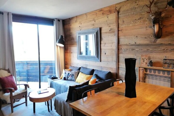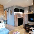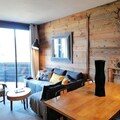 The apartment boasts a fully equipped open kitchen with modern appliances, including an induction hob, fridge/freezer, dishwasher, microwave, Nespresso coffee machine, and specialty cookware like a raclette machine, fondue set, and pierrade. The bathroom features a bathtub and a washing machine, while a separate WC adds convenience. With parquet floors, elegant decor, a private ski locker, and outdoor parking access, this apartment is an ideal choice for a stylish and hassle-free mountain getaway.
