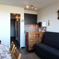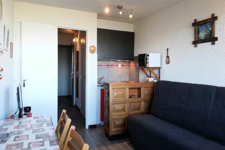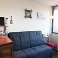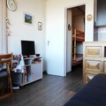This cozy studio, located in a building with an elevator, accommodates 2 to 4 people and offers a comfortable 24m² space. It includes a mountain area with 2 bunk beds separated by curtains and a living room with a 2-seater sofa bed, TV, and storage. The apartment faces the North/East side, providing a stunning view of the valley from the balcony, accessible via an electric roller shutter. The studio is a non-smoking apartment and features a parquet floor. Heating and hot water are provided by a collective system. Pets are not allowed, ensuring a quiet and clean environment for all guests.
