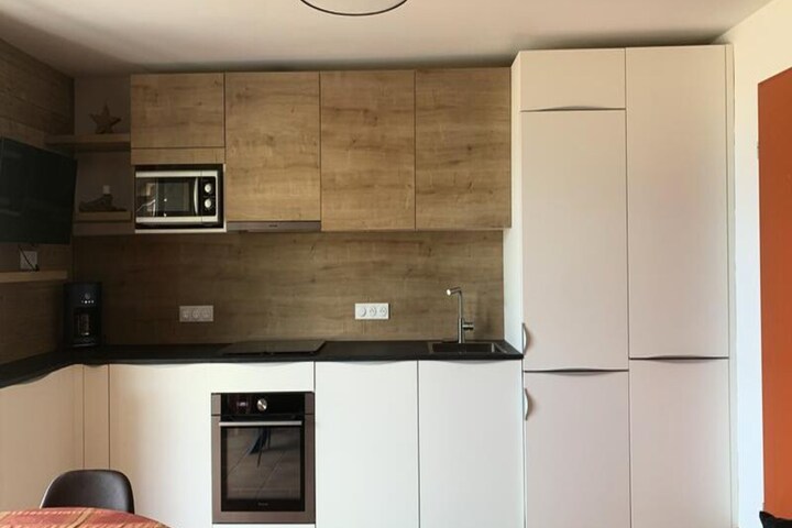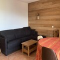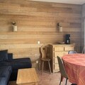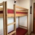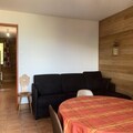 This charming 3-room apartment, located on the ground floor, is ideal for 7 to 8 guests. It features two bedrooms, each with a double bed, duvets, and ample storage space. The living room includes a double convertible sofa, a TV, and access to a balcony with stunning mountain views. A sleeping area with a set of bunk beds provides additional sleeping arrangements. The apartment is non-smoking and pets are strictly prohibited, ensuring a clean and peaceful environment for all guests.