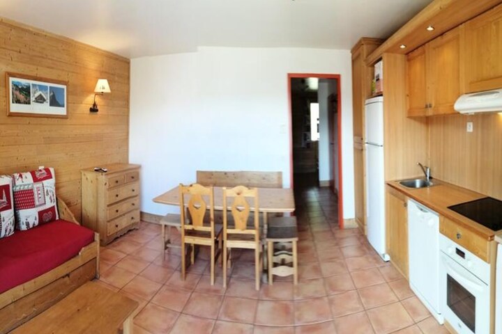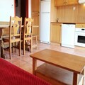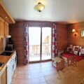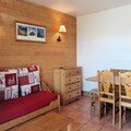 This cozy 3-room apartment, ideally suited for 7-8 people, is located on the ground floor and offers an east-facing orientation with a balcony that provides a stunning view of the mountains. The apartment features a welcoming entrance area with a set of bunk beds, while the spacious living room includes a pull-out sofa bed, a television, a dining area, and balcony access for relaxation with scenic views. The two bedrooms are furnished with double beds and ample storage for your belongings, ensuring comfort during your stay. Please note, the apartment is non-smoking, and pets are strictly prohibited.