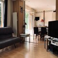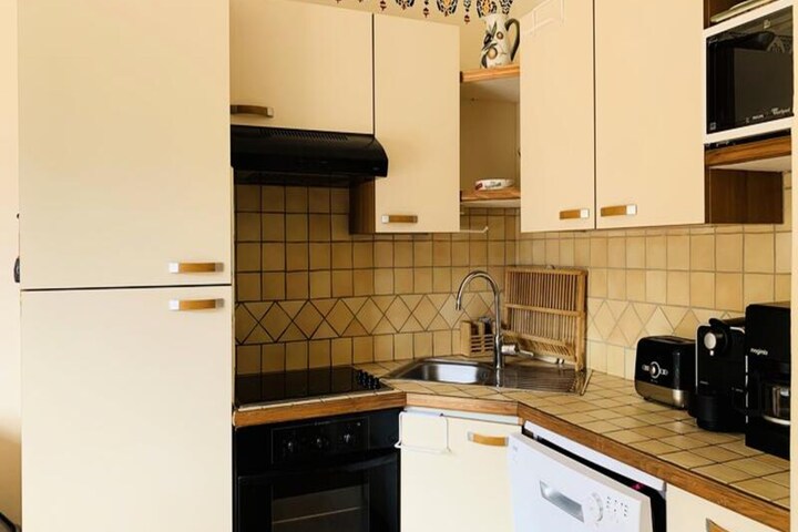 This spacious and bright 47m² apartment is perfect for a family or group of up to 6 people. It features a cozy living room with a single sofa and a 2-seater convertible sofa, along with a flat-screen TV for entertainment. The bedroom includes a bunk bed and a double bed on the mezzanine, providing ample sleeping space. The apartment is non-smoking and pets are strictly prohibited. A deposit of €260 is required, and heating is included. For added convenience, a garage space is available for rent at €80 per week.