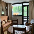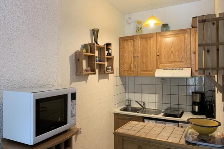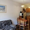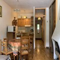 Located on the second floor with elevator access, this south-facing studio offers a balcony with views of the square, shopping mall, and slopes. The living room is bright and features an HD TV and cupboard. The kitchen area is equipped with two ceramic hobs, a hood, microwave, refrigerator, and dishwasher, and features attractive wooden furniture. There is a bathroom with a bathtub and a separate WC. A ski box is located on level -1. A deposit is required. Heating is included.