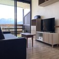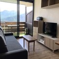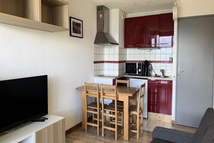 This bright studio, located in a building with an elevator, offers a cozy space for up to 4 people. The studio features a mountain area with 2 bunk beds and a living room with a 2-seater convertible sofa. It is equipped with a large HD TV, a dining area, and access to a south/east-facing balcony that provides a stunning view of the mountains, including the summit of Pain de Sucre. The property is non-smoking and pets are strictly prohibited, ensuring a clean and allergy-friendly environment.