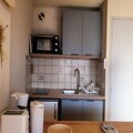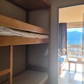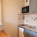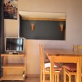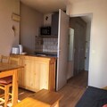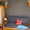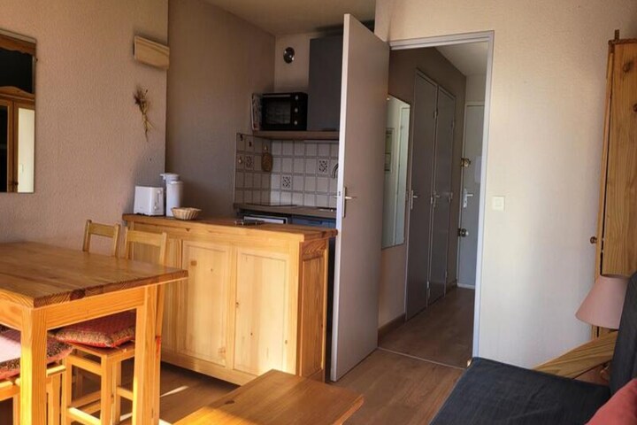 This bright and inviting studio accommodates up to four guests, making it ideal for couples or small families. The cleverly designed layout includes an entrance alcove with bunk beds and a living room featuring a pull-out pine sofa bed. The kitchenette is equipped with all the essentials, including a refrigerator, ceramic hobs, a mini oven, and small appliances like a toaster and kettle, ensuring you can prepare hearty meals after a day on the slopes. The east-facing balcony provides a tranquil spot to unwind and soak in the stunning valley views, while the TV and cozy furnishings create a warm and relaxing atmosphere.