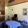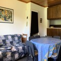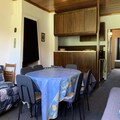 Inside, the apartment comfortably accommodates up to six guests. The layout includes a bedroom with two single beds, a living room featuring a double sofa bed and two single sofa beds, and a dining area with a decorative fireplace that adds a touch of warmth and charm. The open-plan kitchen is equipped with all the essentials, including a refrigerator, stove, microwave, and filter coffee maker, ensuring you can prepare hearty meals after a day on the slopes. The bathroom, though slightly dated, offers a bathtub for a relaxing soak, and there is a separate WC for added convenience. Additional perks include a private ski locker and reserved parking for residents.