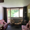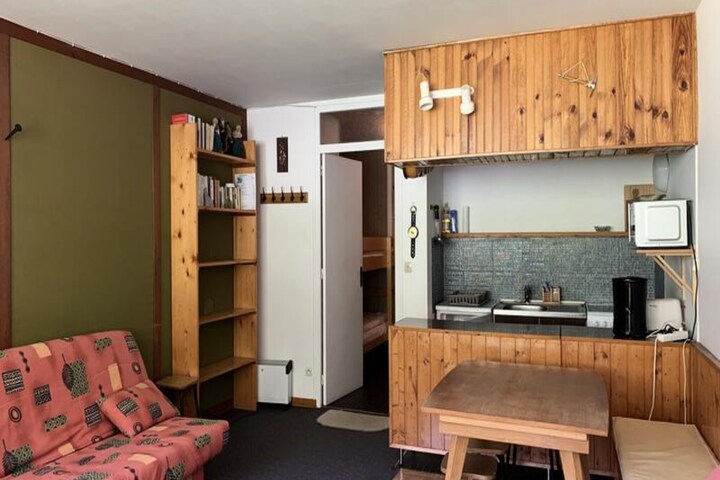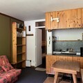 This cozy studio apartment, located on the third floor of a residence without an elevator, offers a comfortable stay for up to four guests. It features a sleeping area with two bunk beds, as well as a spacious living room with a two-seater sofa bed and an additional sofa bed. For your entertainment, the living room is equipped with a flat-screen TV, and the large south-facing balcony offers a stunning view of the slopes. Please note, the apartment is non-smoking, and pets are not allowed.