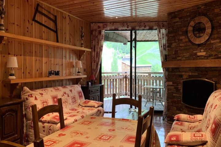 This charming studio, located on the 6th floor of a building with an elevator, offers space for up to 4/5 people. It features a cozy living room with a 2-seater BZ type convertible sofa, flat-screen TV, and access to a large terrace with stunning views of the slopes and Pain de Sucre. The studio includes two bunk beds in the entrance corridor and a beautiful, renovated bathroom. Please note, pets are strictly prohibited, and this is a non-smoking apartment. A deposit is required at check-in.