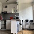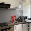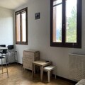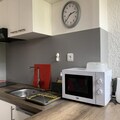 Inside, the studio is equipped with a fully functional kitchen, including a top refrigerator, two ceramic hobs, an oven, and a mini dishwasher. The kitchen also features an extractor hood, a filter coffee maker, a kettle, and a microwave for added convenience. Whether you're preparing a quick meal or a cozy dinner, this kitchen has everything you need. The apartment also includes heating to ensure a comfortable stay during colder months, making it an ideal retreat for both winter and summer stays.