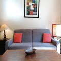 This charming studio, located on the 4th floor of a building with an elevator, offers a comfortable stay for up to 4 guests. It features a sleeping area with 2 bunk beds, a living room with a Rapido sofa bed, a flat-screen TV, and a dining area. The studio is non-smoking and pets are strictly prohibited. The south-facing balcony provides a lovely outdoor space to relax, while the apartment’s cozy design and parquet flooring create a warm atmosphere. A deposit is required upon arrival, and guests can access a ski box located at the entrance of the residence for convenient storage.