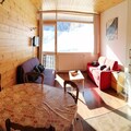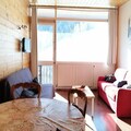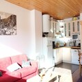 This charming 42m² 2-room apartment accommodates up to 6 people and is perfect for both winter and summer stays. Located on the 3rd floor of a building directly on the slopes, the apartment offers a cozy, renovated interior with a south-facing balcony that overlooks the slopes and Pain de Sucre. The living area includes a 2-seater sofa bed, an HD TV, a dining area, and access to the balcony. A wooden corridor leads to the bedroom with two single beds that form a large double bed and ample storage space.