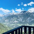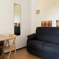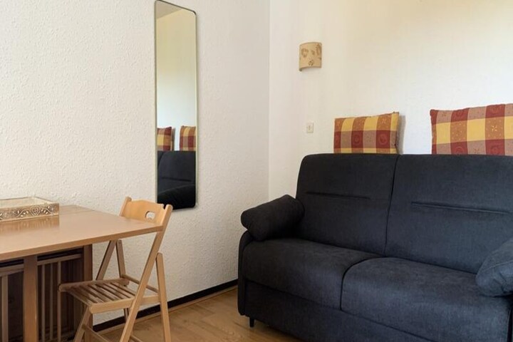 This cozy studio apartment, located in Building "C" with elevator access, comfortably accommodates up to 4 guests. Situated on the 10th floor, the apartment offers a charming west-facing balcony with stunning views of the valley and surrounding mountains. The sleeping area includes two bunk beds, each with a duvet, while the living room features a two-seater sofa bed, a flat-screen TV, and access to the balcony. The apartment is pet-free and non-smoking, ensuring a clean and comfortable environment for all guests.