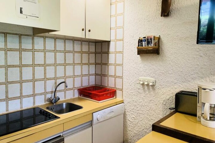 The apartment is equipped with a fully functional kitchen, including an oven, refrigerator, dishwasher, and coffee maker, allowing guests to prepare their own meals. With a south-facing balcony and beautiful mountain views, the space offers comfort and convenience. A renovated bathroom and additional features like a ski box complete the setup for a pleasant stay.