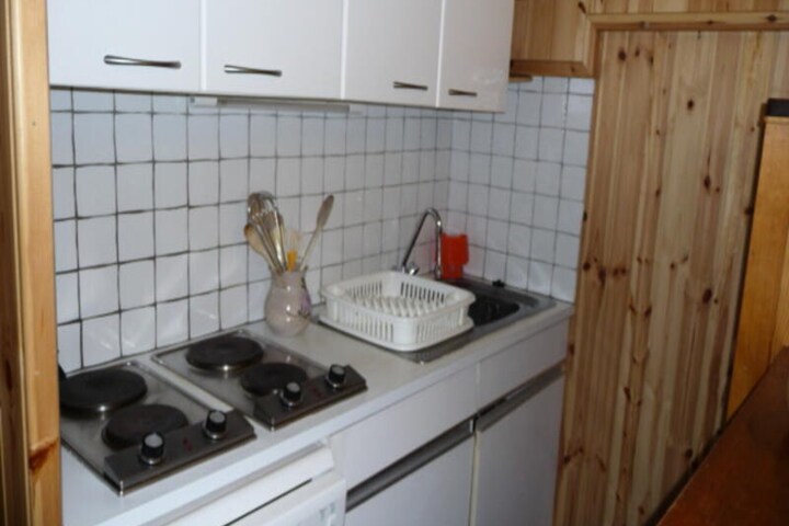 This cozy 3-room apartment for 6 people is ideally located just 100 meters from the slopes and the Chalvet Gondola, making it perfect for ski enthusiasts. Situated on the ground floor, the apartment offers a total living space of 57 m² with a west-facing orientation and direct access to the garden and two small terraces. The living room features a large corner sofa for 6 people, a coffee table, and a dining area with seating for 6. There is also a TV and access to the balcony with a beautiful view of Janus. The kitchen is equipped with 4 electric hotplates, a dishwasher, small oven, microwave, fridge with freezer compartment, coffee maker, toaster, and kettle.