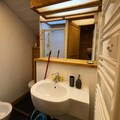 Inside, the apartment features a fully equipped kitchen with an induction hob, microwave, dishwasher, and refrigerator with freezer section, along with a coffee maker, kettle, and various kitchen accessories. The bathroom is equipped with a shower cabin, toilet, and bidet. The cozy living area includes a dining table for four, a sofa, and a television, making it a perfect space to relax after a day of skiing.