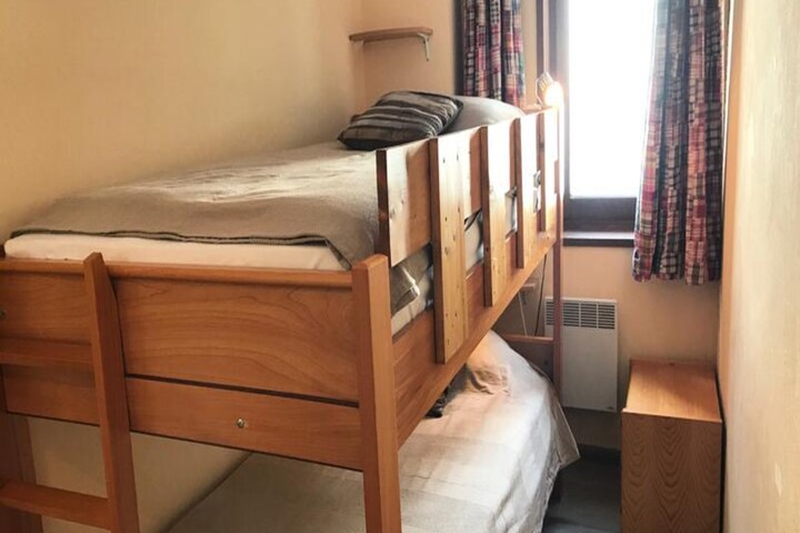This spacious apartment, perfect for up to 7 guests, offers a comfortable stay with various bedding options including a double bed, bunk beds, a single bed in the mountain corner, and a convertible sofa in the living room. Pets are allowed with an additional fee, and the property is non-smoking. The apartment features a large living space with a flat-screen TV and a DVD player, ensuring relaxation after a day of skiing. There is also a ski locker available for your convenience.
