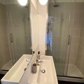 Bathroom: Shower cabin with shower screen, cabinet with sink, towel rack, large mirror.