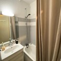 The well-equipped kitchen features 4 electric hotplates, a microwave, oven, dishwasher, fridge, coffee maker, toaster, and kettle. The living room has a wall-mounted TV, a sofa, and a dining area for 4 people. The bathroom includes a bathtub, sink, mirror, and electric towel dryer, while the separate WC provides added convenience. Parking is available, subject to availability, with 2 private spaces reserved for the residence.