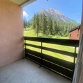 The apartment includes a well-equipped kitchenette with a refrigerator, microwave, dishwasher, and coffee maker. The living area features a TV and a dining table, with access to a balcony offering beautiful slope views. Additional amenities include a bathroom with a bathtub and separate WC, ski locker, and elevator access.