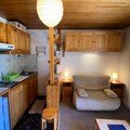 The apartment is well-equipped for a self-catering stay, with a kitchen featuring 2 electric hobs, a microwave, fridge, coffee maker, toaster, kettle, and raclette grill. The living area includes a wall-mounted television, a dining table for 4, and ample storage. The bathroom is fitted with a shower, toilet, washing machine, and hairdryer for your convenience. Additional amenities include a ski locker (for skis on the balcony), and you can rent bed linen, towels, and baby equipment upon request. Wi-Fi, Nespresso coffee makers, and fondue sets are available during your stay.