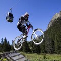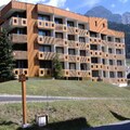 The studio features a compact kitchen area with a fridge, four electric hotplates, a microwave, and essential cookware. The bathroom includes a bath, bidet, sink, and toilet, as well as towel racks and a mirror. There is a ski locker for storing equipment, and the living area has a TV, small dining table, and two windows offering views of the north and west sides. The apartment is located on the ground floor, with access to an elevator for convenience.