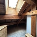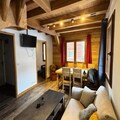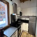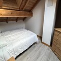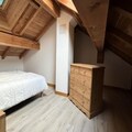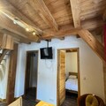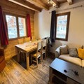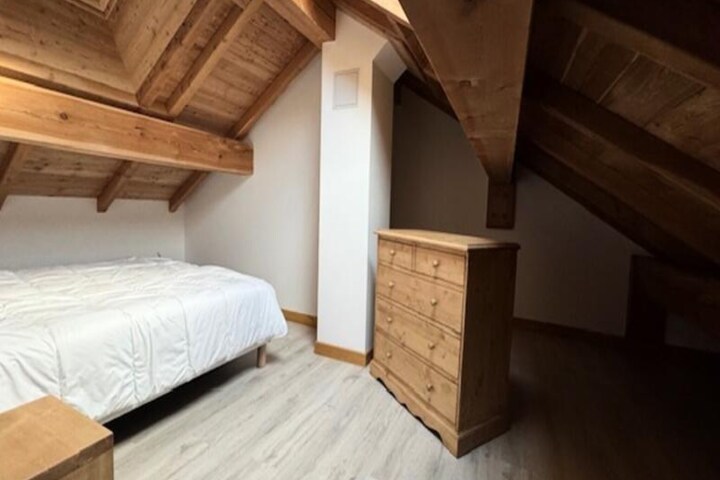 Inside, the duplex apartment is designed to accommodate up to five guests in style and comfort. The main floor features a welcoming entrance hall with a wardrobe, a fully equipped kitchen with modern appliances, and a cozy living room complete with a television and a comfortable sofa. The dining area, with its wooden table and chairs, invites you to share meals and stories after a day on the slopes. The main bedroom offers a double bed with plush bedding, while the upstairs refuge-style area under the beams provides additional sleeping arrangements with three single beds. A sleek shower room, separate WC, and heated ski locker add to the convenience.