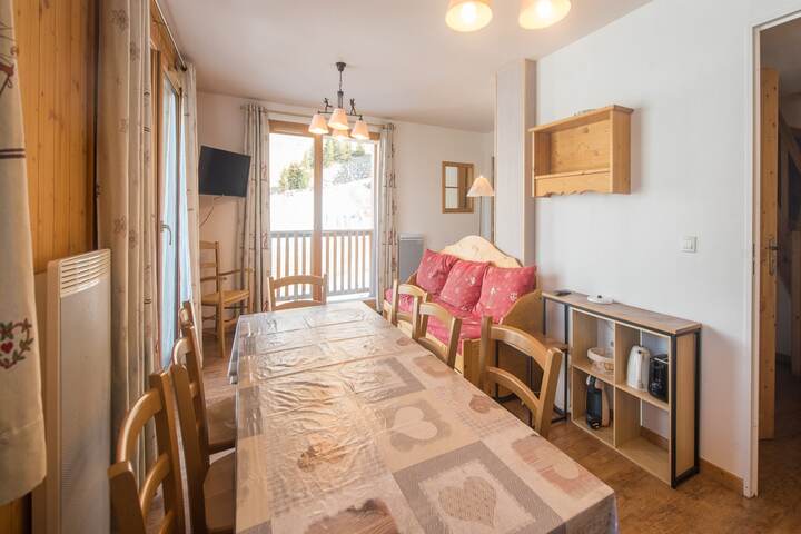 This cozy and fully equipped 55 m² apartment offers a comfortable stay for up to 8 guests, making it perfect for families or groups seeking a mountain getaway. Located at the foot of the ski slopes, it features stunning mountain views and modern amenities. The property includes 2 spacious bedrooms, a private balcony for enjoying the fresh alpine air, and essentials such as Wi-Fi, a TV, and access to a communal heated swimming pool. Additional conveniences include an elevator and a garage in the adjoining building, ensuring a stress-free stay.