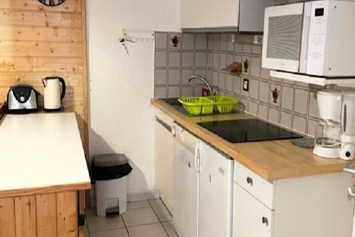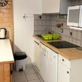 The apartment includes a well-equipped kitchen with a dishwasher, microwave, and other essentials for preparing meals. The bathroom has a bathtub, and a washing machine is provided for added convenience. The apartment also includes a ski locker for storing gear. Note that snow removal from loggias or balconies is not included during winter.