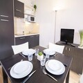 The residence boasts a range of thoughtful amenities to enhance your stay. Relax in the large heated indoor pool, complete with integrated whirlpools, or soak up the sun on the outdoor terrace, a delightful spot in both winter and summer. The cozy studio apartment accommodates up to four guests, featuring a living room with a double sofa bed, a sleeping area with bunk beds, and a well-equipped kitchenette for preparing hearty meals after a day on the slopes. A private balcony invites you to unwind with stunning views of the surrounding mountains.