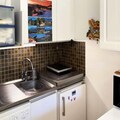 Designed to accommodate 4 to 6 guests, the apartment is thoughtfully laid out to maximize comfort and functionality. The entrance hall features a cozy double bed, while a sleeping alcove with two single bunk beds provides a fun and practical space for families or groups. The living room, complete with a comfortable double sofa bed, opens onto a fully equipped kitchenette, perfect for preparing meals after an active day. A bathroom and separate toilet add convenience, and the inclusion of a washing machine ensures a hassle-free stay.