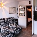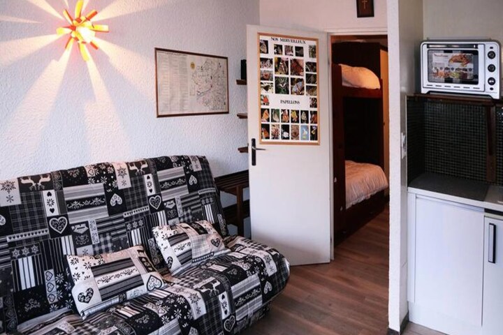 Designed to accommodate up to four guests, the studio features a practical and cozy layout. The entrance hall leads to a sleeping alcove with two single bunk beds, perfect for children or friends. The living area includes a comfortable double sofa bed, creating a welcoming space to unwind after a day on the slopes. The open-plan kitchen is equipped with everything you need to prepare hearty meals, while the bathroom with WC ensures convenience. Additional amenities include a ski locker at the residence entrance and access to a large communal outdoor parking area.