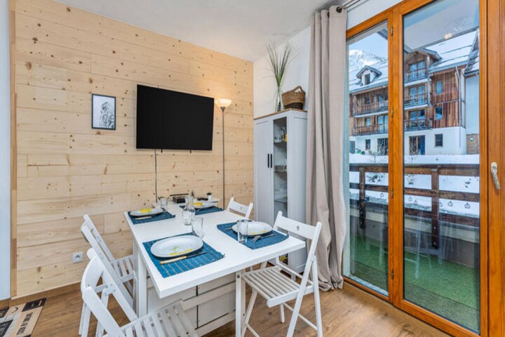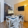 This thoughtfully designed 24 m² studio apartment accommodates up to four guests, making it ideal for small families or couples. The warm and inviting interior features a recently updated double sofa bed in the living area, two single bunk beds in the entrance hall, and a fully equipped kitchen for preparing hearty meals after a day on the slopes. The west-facing balcony is a delightful spot to enjoy your morning coffee or evening aperitifs while soaking in the tranquil alpine views. Additional amenities include a private ski locker and access to the residence’s heated indoor pool, complete with a whirlpool and outdoor terrace—a true oasis for relaxation in any season.
