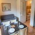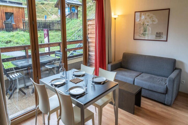 High above the charming hamlet of Bois Méan, at an altitude of 1800 meters, this cozy studio apartment offers an idyllic mountain escape for families and couples alike. With its west-facing orientation, you’ll wake up to the sun-drenched slopes and enjoy tranquil evenings on your private balcony, surrounded by the serene beauty of the French Alps. Whether you’re here to ski, relax, or explore, this residence is perfectly positioned to make your holiday unforgettable. \n\nThe 24 m² studio is thoughtfully designed to accommodate up to four guests, featuring a comfortable living area with a sofa bed, a separate entrance with a bunk bed and new bedding, and a fully equipped kitchen complete with a dishwasher and raclette grill. After a day on the slopes, unwind in the heated indoor pool with a whirlpool or soak up the alpine sun on the outdoor terrace. The residence also offers convenient amenities such as a private ski locker and the option to order fresh bread and pastries for your mornings. \n\nFamilies will love the proximity to the daycare center and snow garden, making it easy to drop off little ones before heading to the nearby Préclaux magic carpet lift or Prébois chairlift. Shops, restaurants, and ski rental facilities are just steps away, while the ESF ski school and lift ticket offices are conveniently located right below the residence. \n\nWhether you’re savoring breakfast on the balcony, exploring the surrounding trails, or enjoying après-ski moments with loved ones, this mountain retreat promises a blend of comfort, convenience, and breathtaking alpine scenery. Make memories that last a lifetime at Les Terrasses du Soleil d’Or.