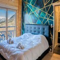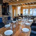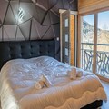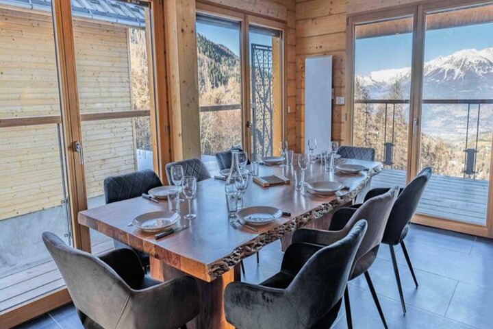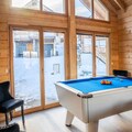 The chalet spans 130 square meters and features five beautifully appointed bedrooms, each with its own bathroom. The master suite on the ground floor boasts a luxurious double bed and an en-suite bathroom with a walk-in shower and bathtub. Upstairs, the remaining bedrooms offer flexible sleeping arrangements, including double beds, single beds, and bunk beds, ensuring comfort for all. The central living area is a true highlight, with large windows flooding the space with natural light and opening onto a terrace with panoramic views. Cozy evenings await in the living room, complete with a wood-burning stove, plush sofas, and a billiards area for entertainment. The dining room, designed for gatherings, comfortably seats 16, while the fully equipped kitchen makes meal preparation a breeze.