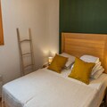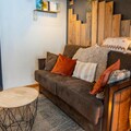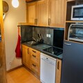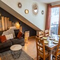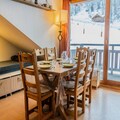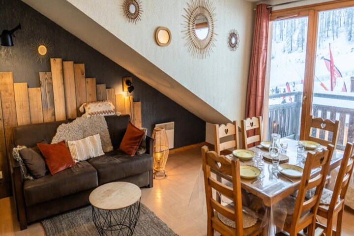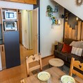 This 36m², newly redecorated apartment is designed for comfort, featuring a cozy living room with a sofa and a fully equipped kitchen with an oven, dishwasher, microwave, hob, fridge, and raclette machine. The dining table accommodates 7 people, ideal for sharing meals after a day of outdoor activities. The east-facing balcony offers scenic views of the slopes and mountains, perfect for enjoying sunny breakfasts. The apartment includes a master bedroom with a double bed, a second bedroom with bunk beds, and additional sleeping arrangements in the living room.