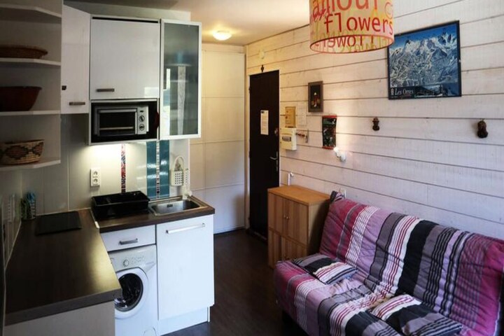 High above the bustling heart of the resort, this fully renovated studio apartment in the Boussolenc residence offers a perfect blend of convenience and alpine charm. Situated on the seventh floor with direct ski-in/ski-out access, this cozy retreat is ideal for couples or small groups seeking an unforgettable mountain getaway. From its south-facing balcony, soak in panoramic views of the slopes while enjoying the crisp mountain air and the vibrant energy of the resort below. Whether you're here for winter sports or summer hikes, this location places you right in the center of it all. \n\nInside, the studio is thoughtfully designed to maximize comfort and functionality. The living room features a plush double sofa bed (160 cm) that ensures restful nights after days of adventure. The open-plan kitchen is fully equipped, making it easy to prepare hearty meals to fuel your activities. A modern shower room with WC and the added convenience of a washing machine complete the amenities, ensuring a hassle-free stay. Warm and inviting, the apartment is a welcoming haven after a day on the slopes or trails. \n\nThe Boussolenc residence is perched just above the shopping arcade, giving you immediate access to a variety of shops, restaurants, and services. Whether you need ski equipment, groceries, or a cozy café to unwind, everything is just steps away. The ski locker on the ground floor adds practicality, making it effortless to store your gear and head straight to the slopes. \n\nChoose this studio for its unbeatable location, modern comforts, and breathtaking views. Whether you're chasing powdery descents or serene alpine trails, this property offers the perfect base for your adventures in the French Alps.